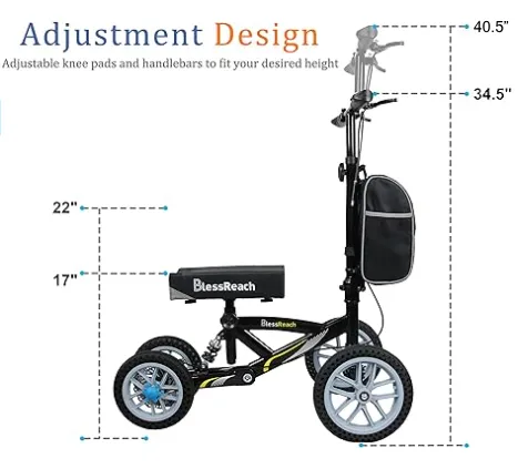 - HUGE & ALL-TERRAIN WHEELS – All-terrain pneumatic wheels come with 12 inches which provide better stability and flexibility when you roll over the knee scooter. Built for snow, mud, dirt, and city roads! Thickened wheels reduce the possibility of puncture.