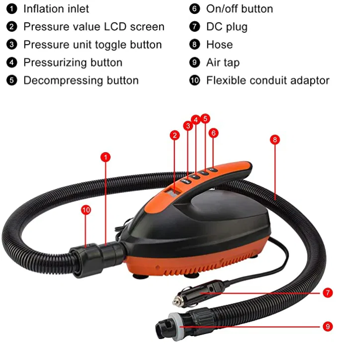 High-pressure SUP electric pump with a digital pressure display you can set a PSI value as a target.