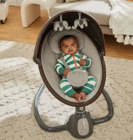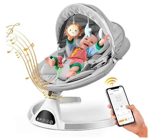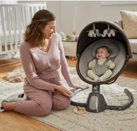 The Baby Swing is a better swing for parents. With its Bluetooth-enabled digital touch screen and remote control, play your baby’s favorite songs from your mobile device or choose from 10 relaxing melodies programmed into the swing—all while your little one softly sways.