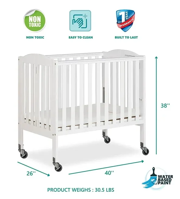 PRODUCT SPECS: Crib dimensions are 40L x 26W x 38H, weighs 30.5 pounds (compared to full size crib dimensions 54L x 31W x 46H, weighs 48 pounds)