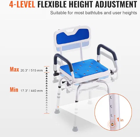 - 360° Swivel Chair with Pivoting Arms: Unlike standard shower chairs, swivel shower chair for the elderly and disabled features a 360° rotating seat for easy pivoting when entering and exiting the bathtub.