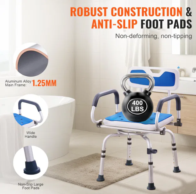 - Strong and Non-Slip: Built with lightweight yet high-strength aluminum, this 360° swivel shower chair for seniors can support up to 400 lbs.